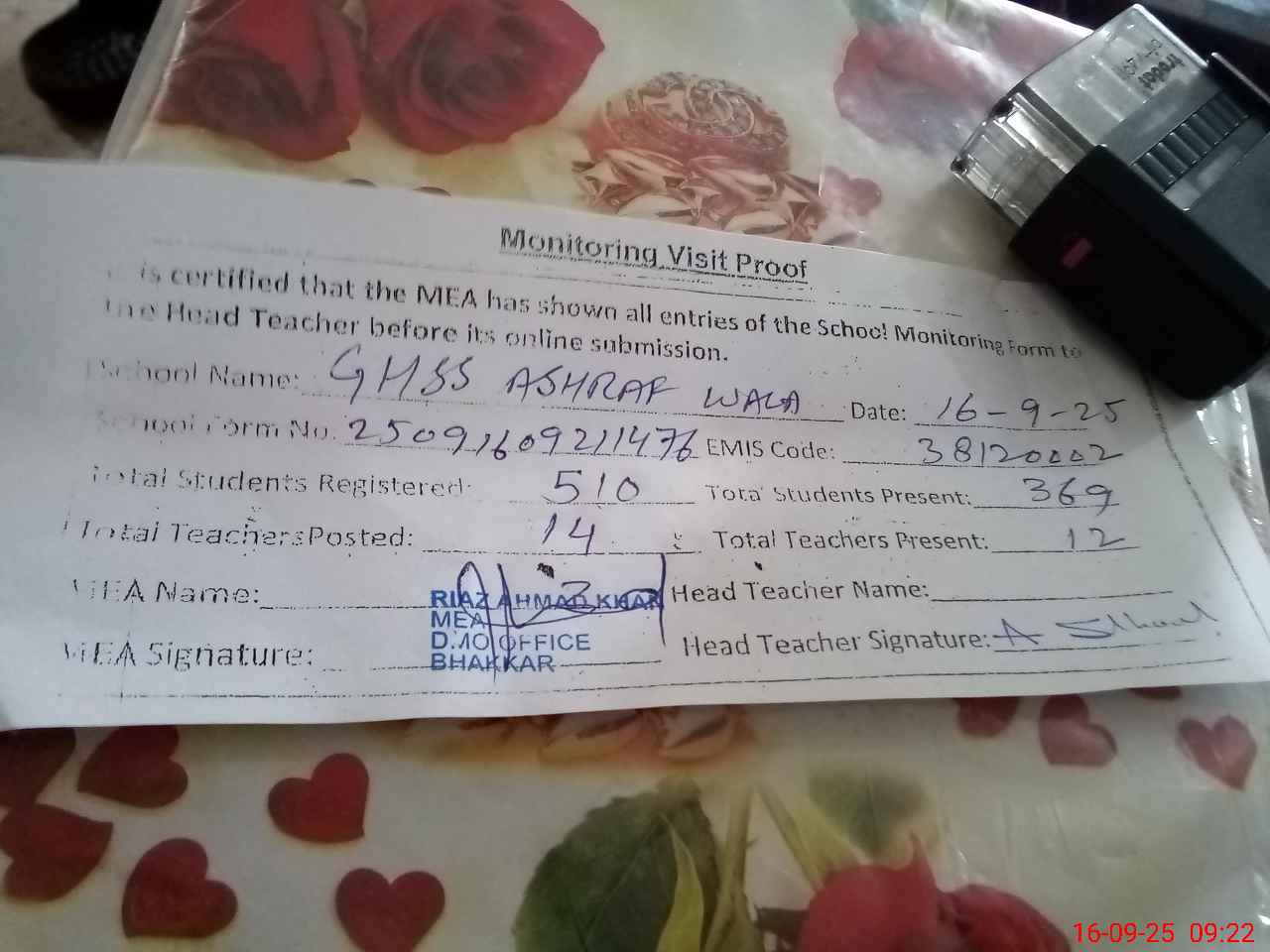 | Attendance Register | Head Teacher | MEA with School | Visit Proof |