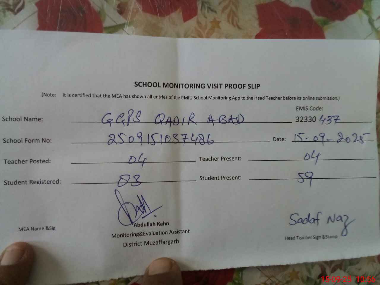 | EMIS Code: 32330437 | Name of School: GGPS QADIR ABAD | |||