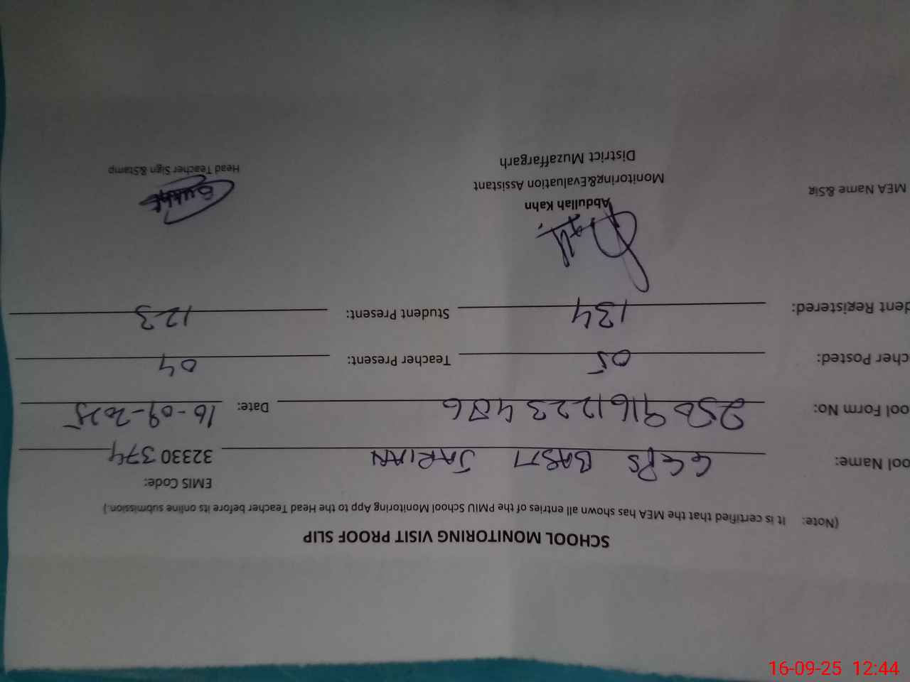 | Monitoring Date: 16-09-2025 | Start Time: 16-09-2025 12:23 PM | End Time: 16-09-2025 12:44 PM | Name of MEA: Ab**** Kh**** | |