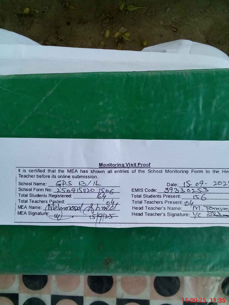 | Attendance Register | Head Teacher | MEA with School | Visit Proof |