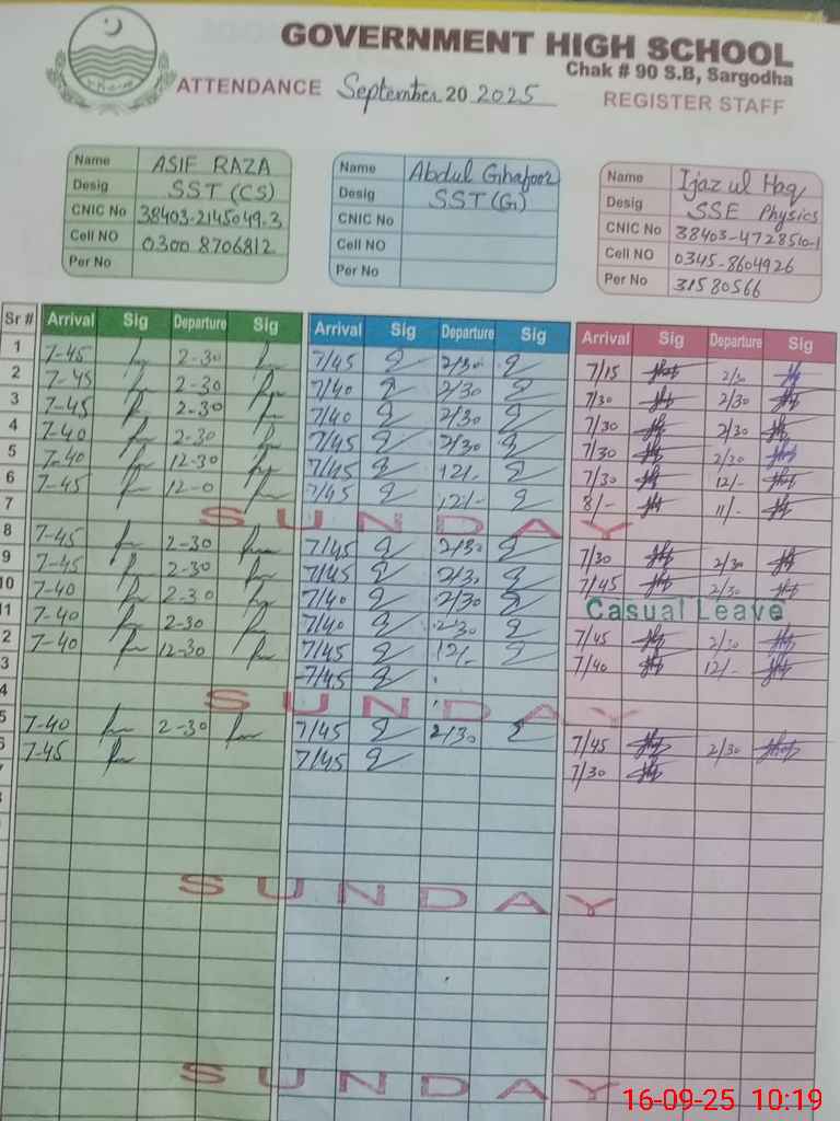 | CNIC | Full Name | Designation | R/C | Absence During Last Calender Month |