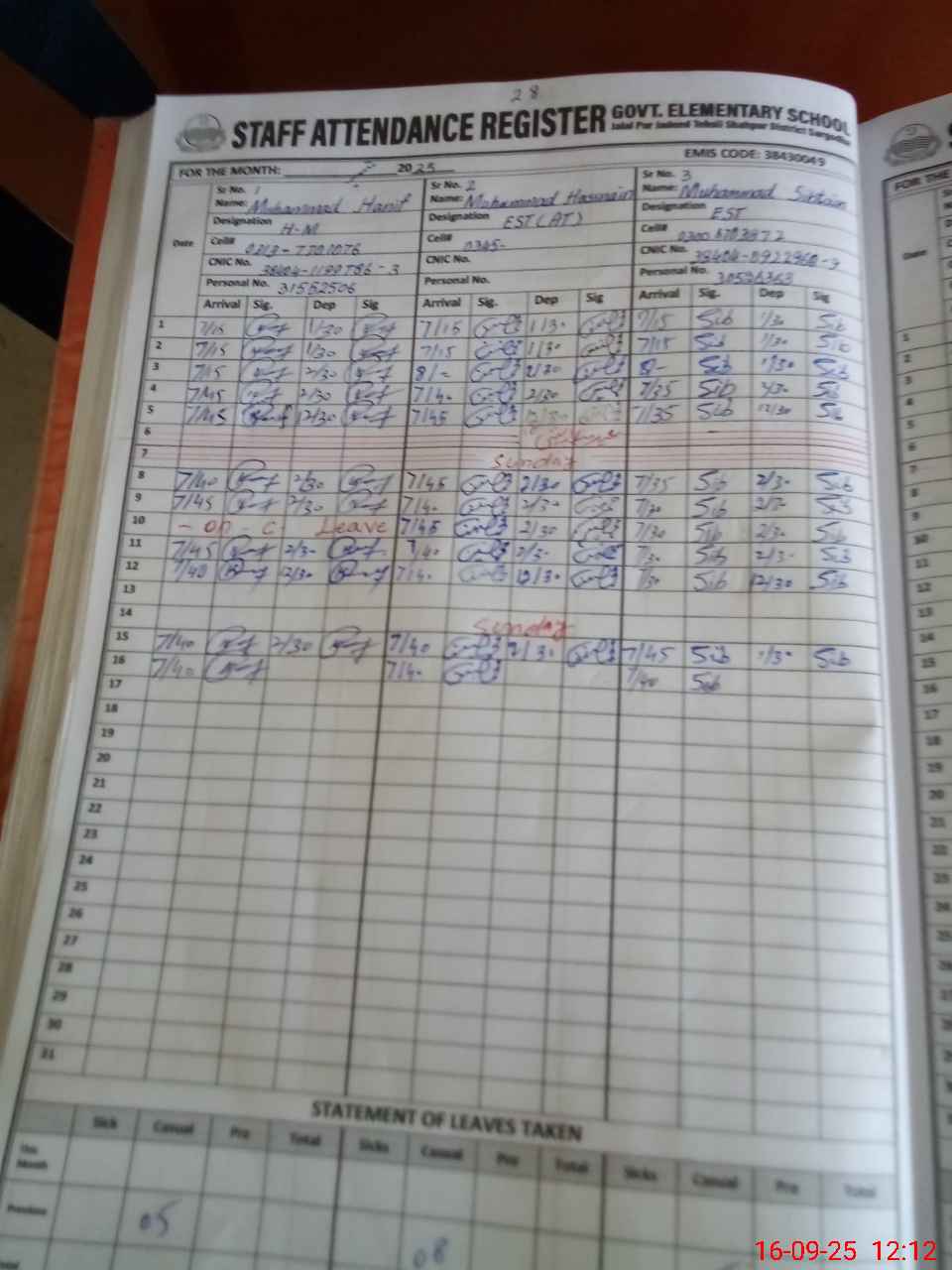 | CNIC | Full Name | Designation | R/C | Absence during last cal. month |