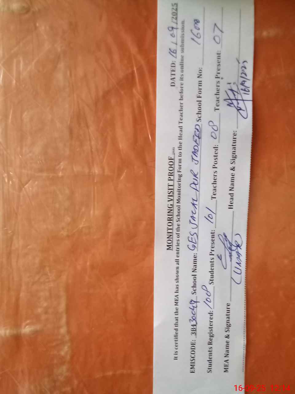 | Attendance Register | Head Teacher | MEA with School | Visit Proof |