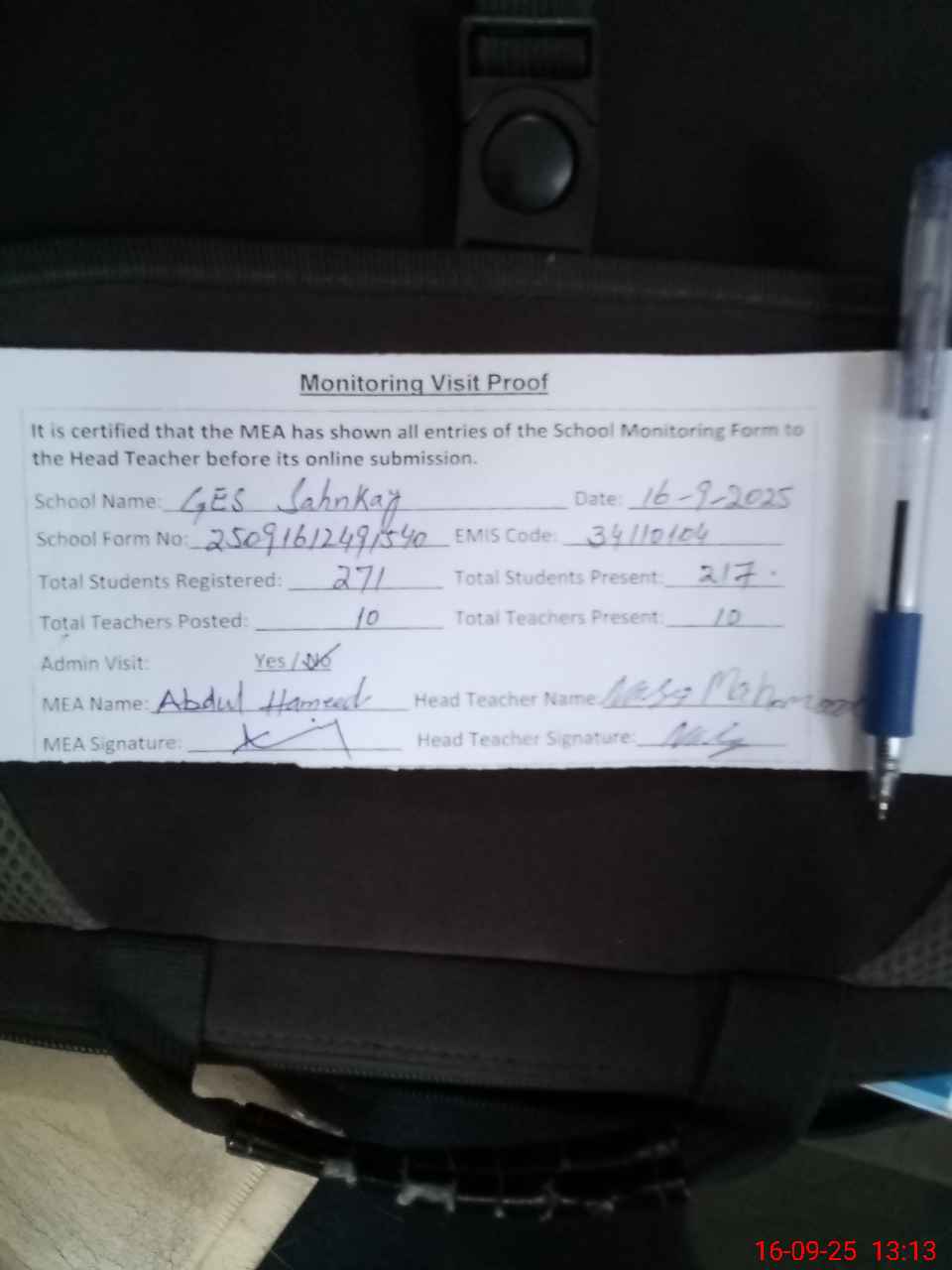 | Attendance Register | Head Teacher | MEA with School | Visit Proof |