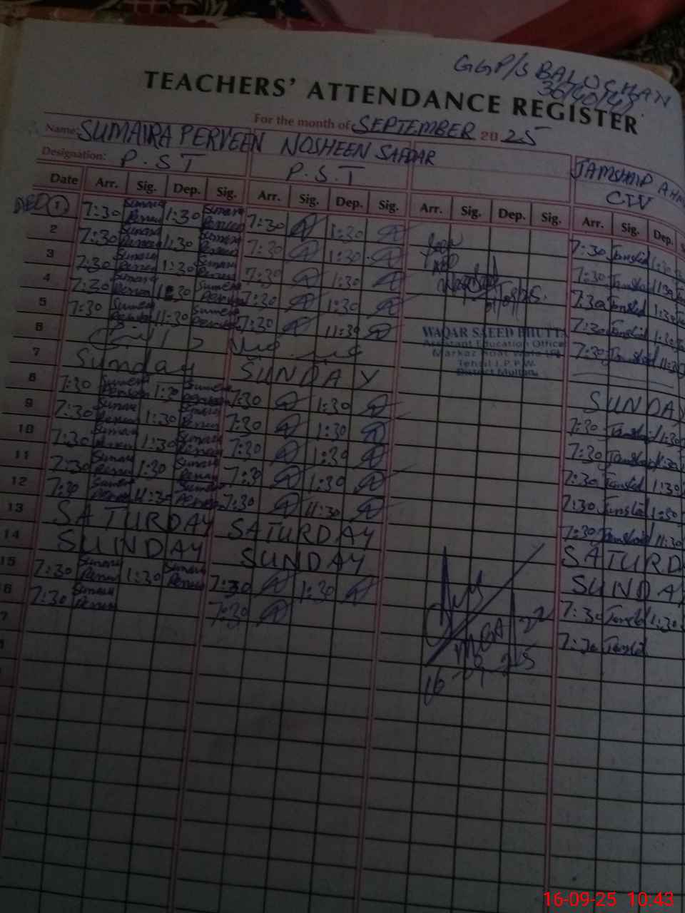 | CNIC | Full Name | Designation | R/C | Absence during last cal. month |