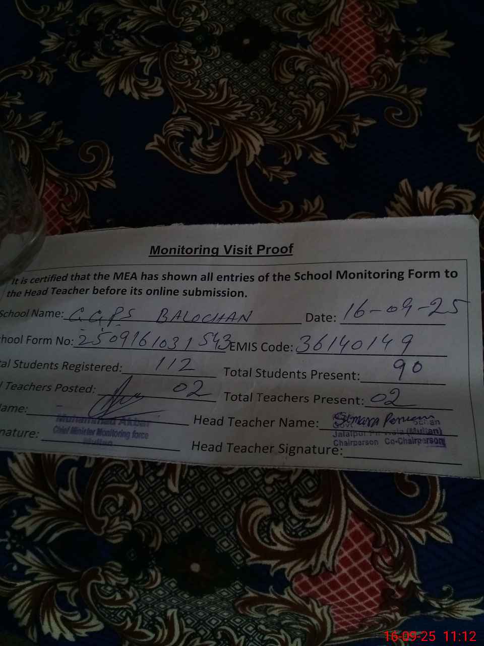 | Attendance Register | Head Teacher | MEA with School | Visit Proof |
