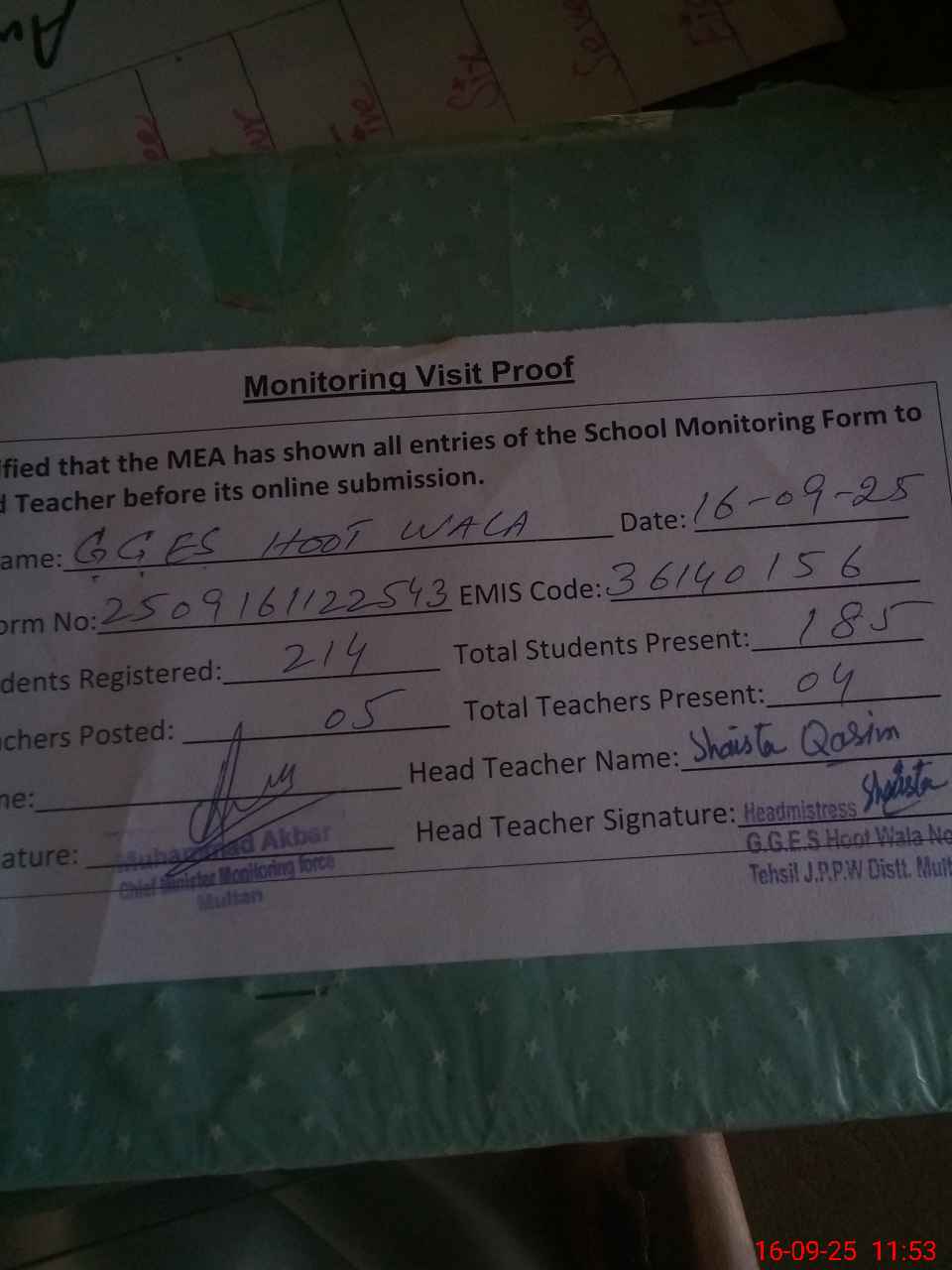 | EMIS Code: 36140156 | Name of School: GGES HOOT WALA NO 1 | |||