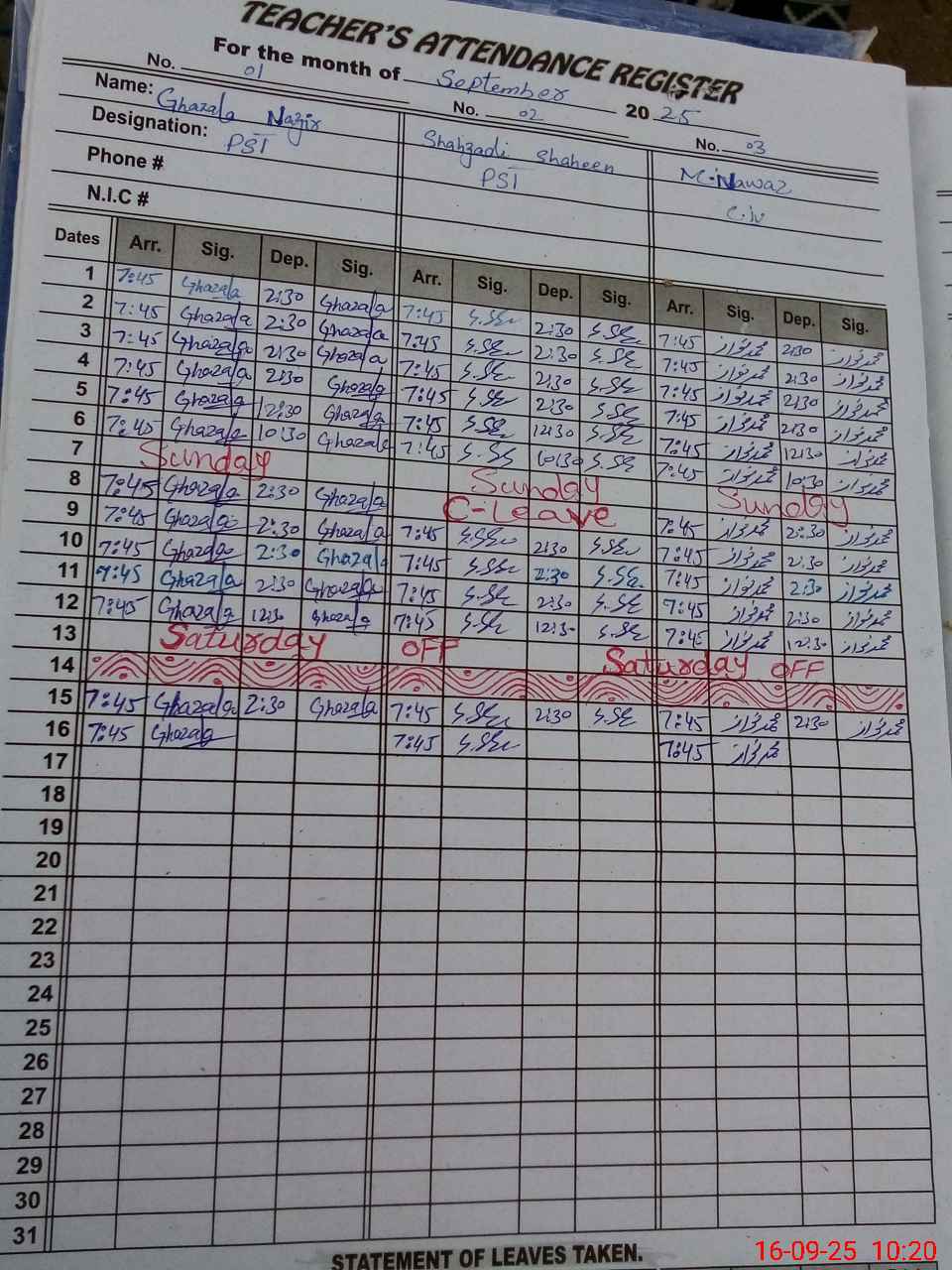 | CNIC | Full Name | Designation | R/C | Absence During Last Calender Month |