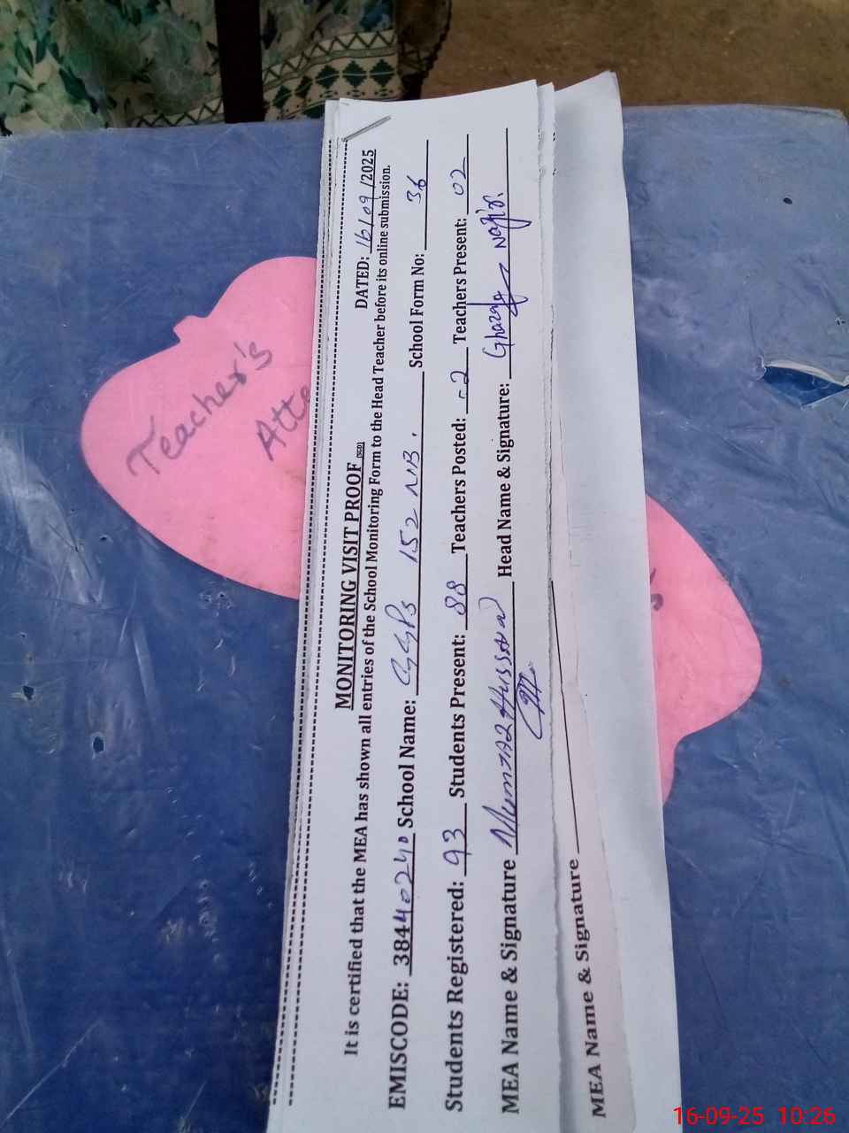 | Attendance Register | Head Teacher | MEA with School | Visit Proof |