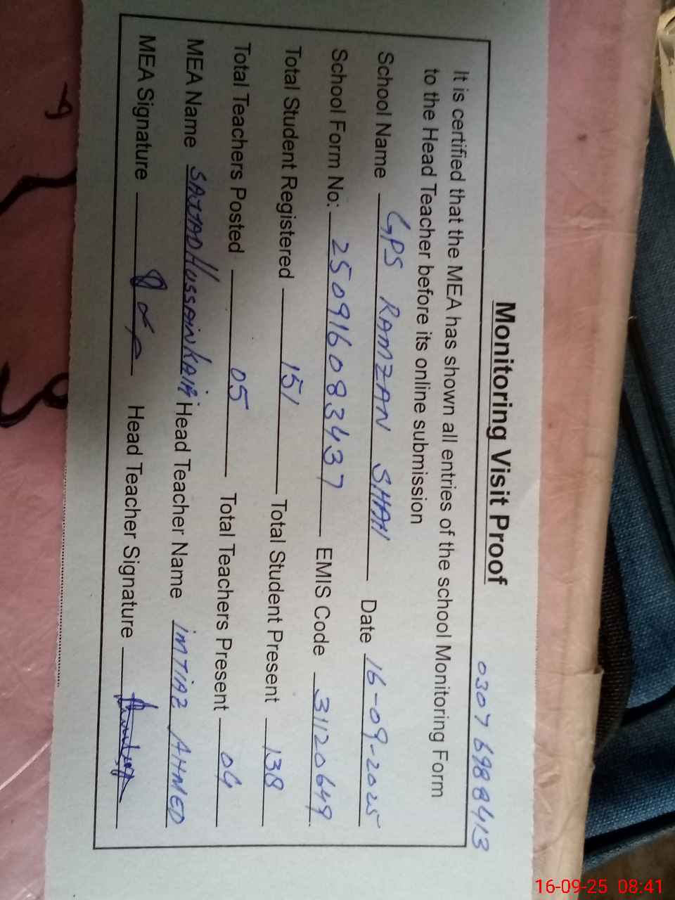 | Attendance Register | Head Teacher | MEA with School | Visit Proof |