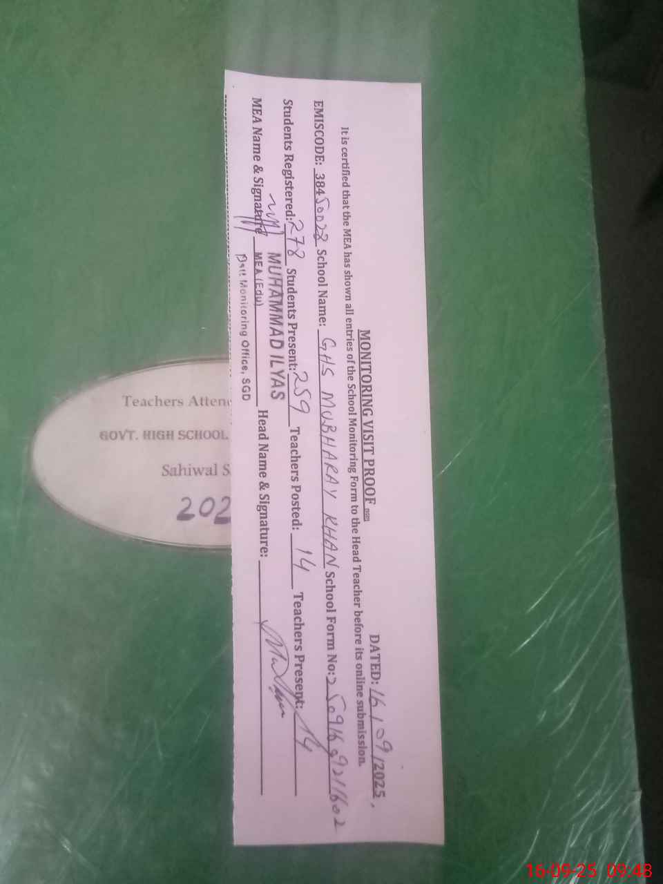 | Attendance Register | Head Teacher | MEA with School | Visit Proof |