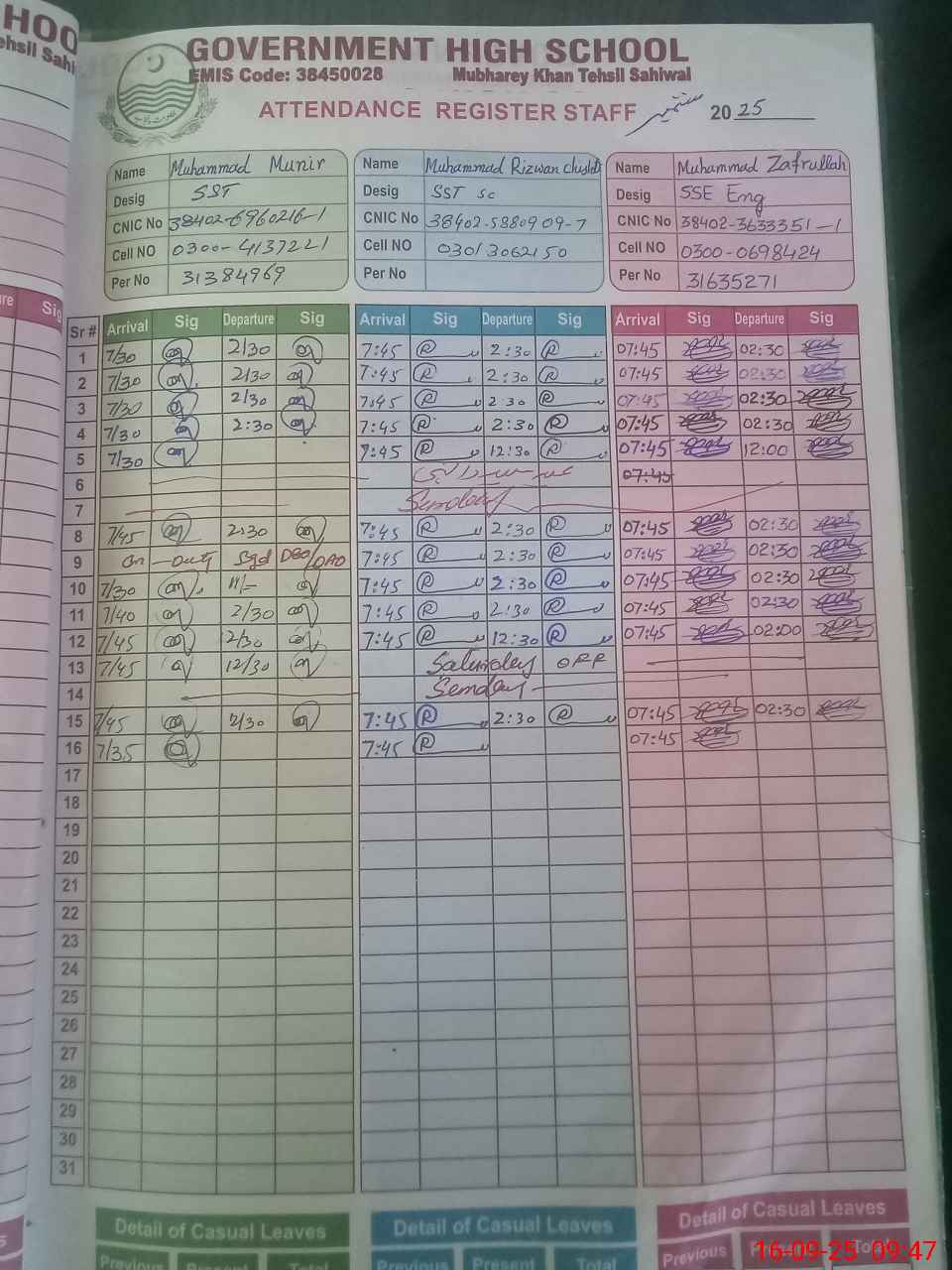 | CNIC | Full Name | Designation | R/C | Absence during last cal. month |