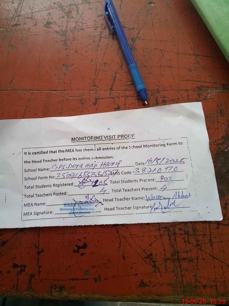 | Attendance Register | Head Teacher | MEA with School | Visit Proof |
