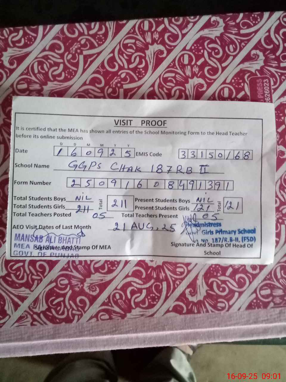 | Remarks (Use Separate Page if Required): NSB register not maintained for the month of AUGUST 25 data verbally given to MEA plus 01 classroom roof needs to be repaired Necessary action may please be taken as necessary | |||||