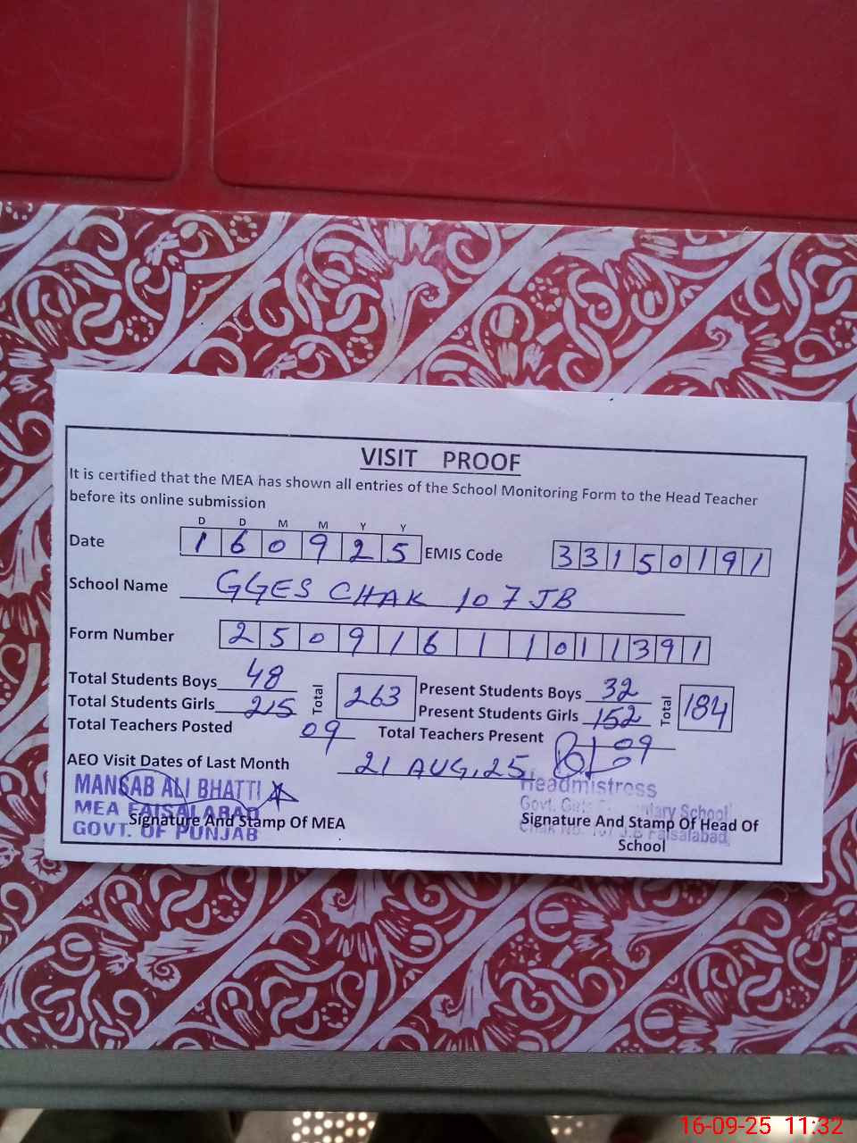 | Certified that this School was Inspected by the Undersigned MEA/DMO Today and the Information Stated Above is as Per Record. | |||||