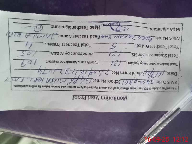 | Attendance Register | Head Teacher | MEA with School | Visit Proof |