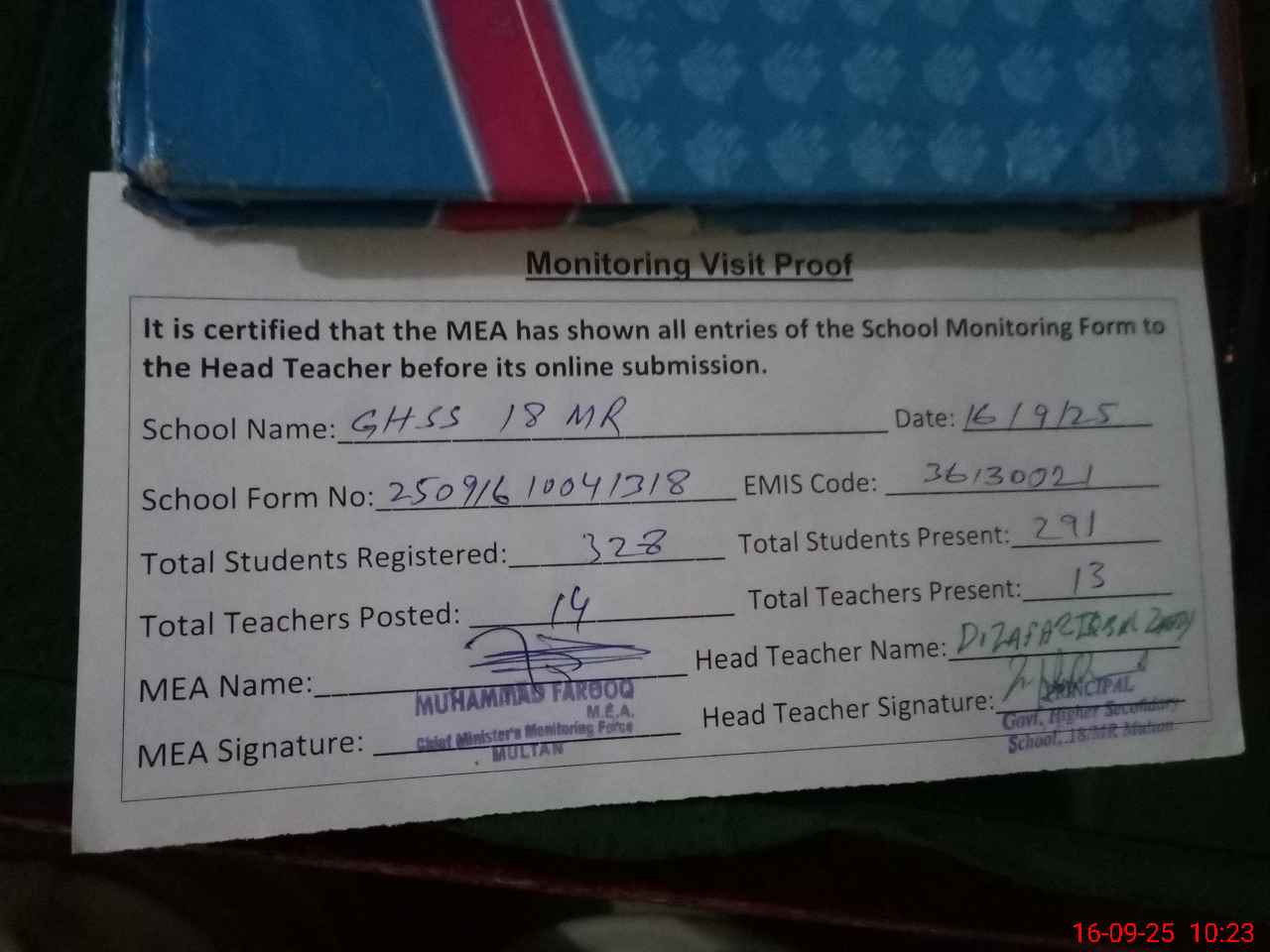 | Attendance Register | Head Teacher | MEA with School | Visit Proof |