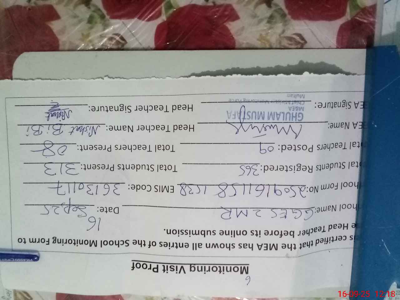 | Attendance Register | Head Teacher | MEA with School | Visit Proof |