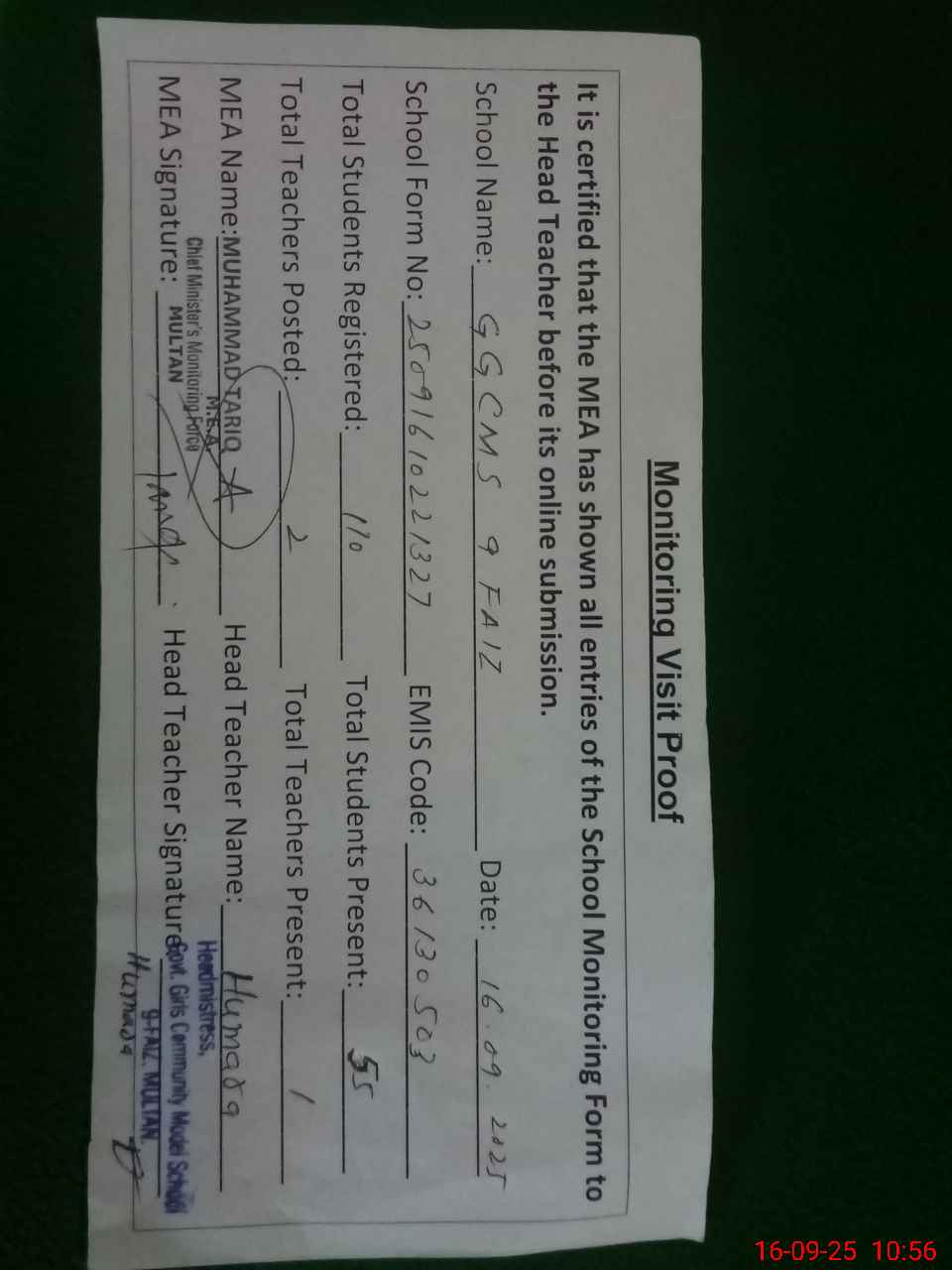 | EMIS Code: 36130503 | Name of School: GGCMS 9-FAIZ MULTAN | |||