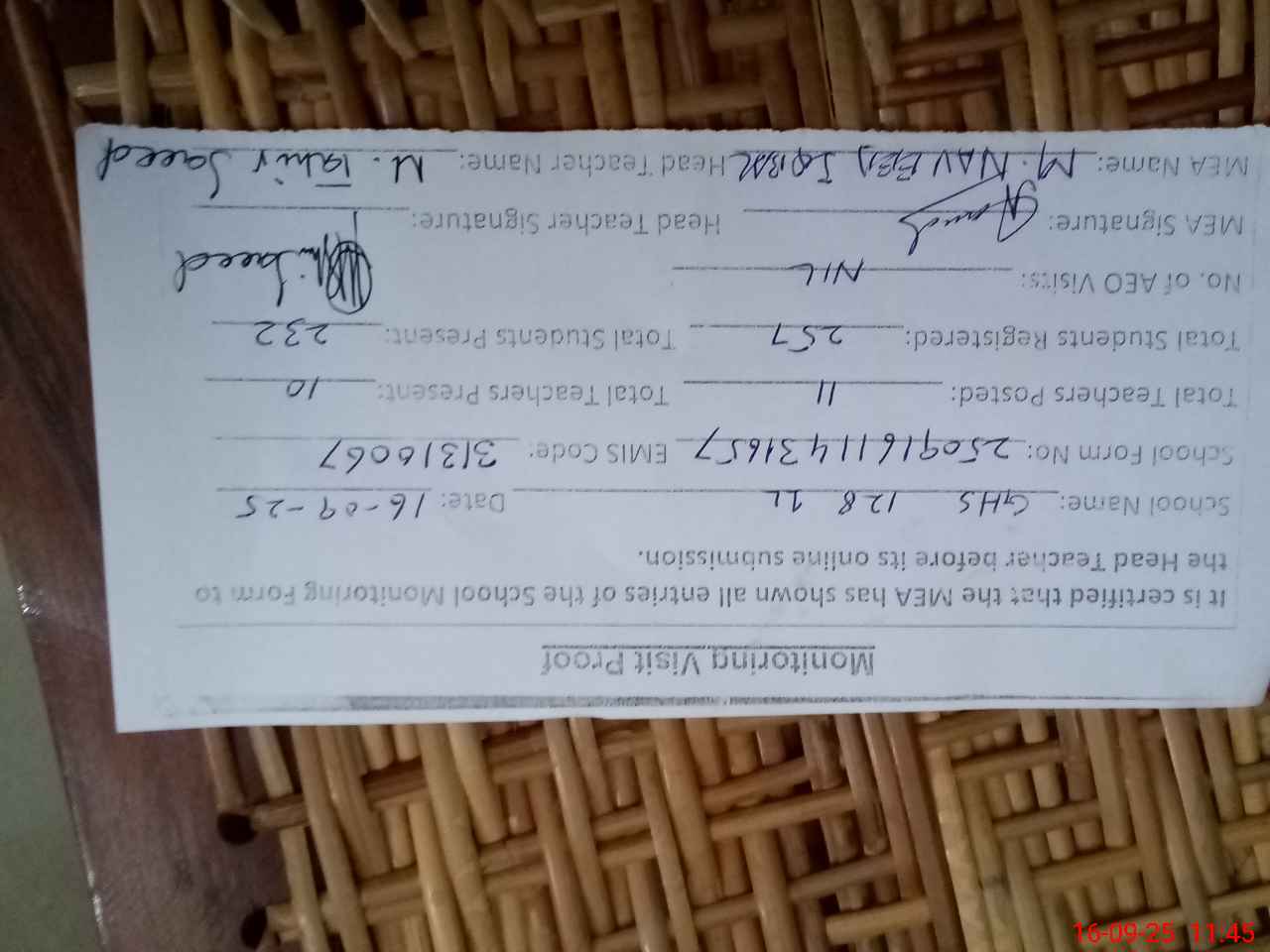 | Certified that this School was Inspected by the Undersigned MEA/DMO Today and the Information Stated Above is as Per Record. | |||||