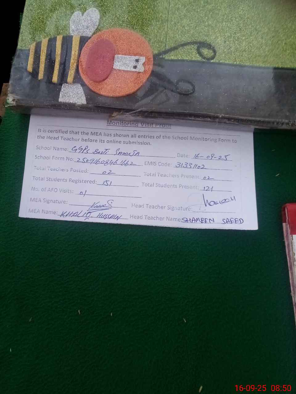 | Attendance Register | Head Teacher | MEA with School | Visit Proof |