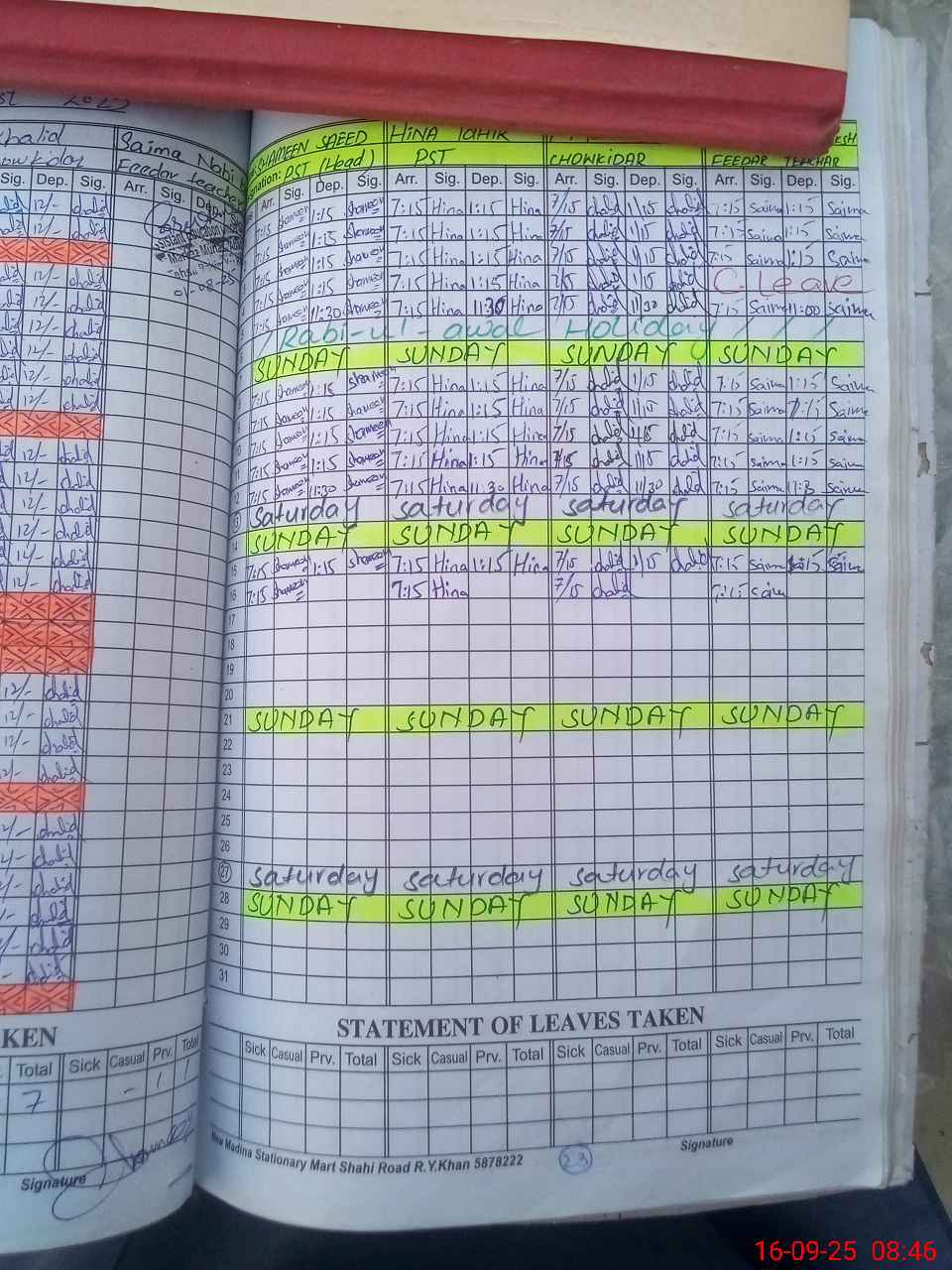 | CNIC | Full Name | Designation | R/C | Absence During Last Calender Month |