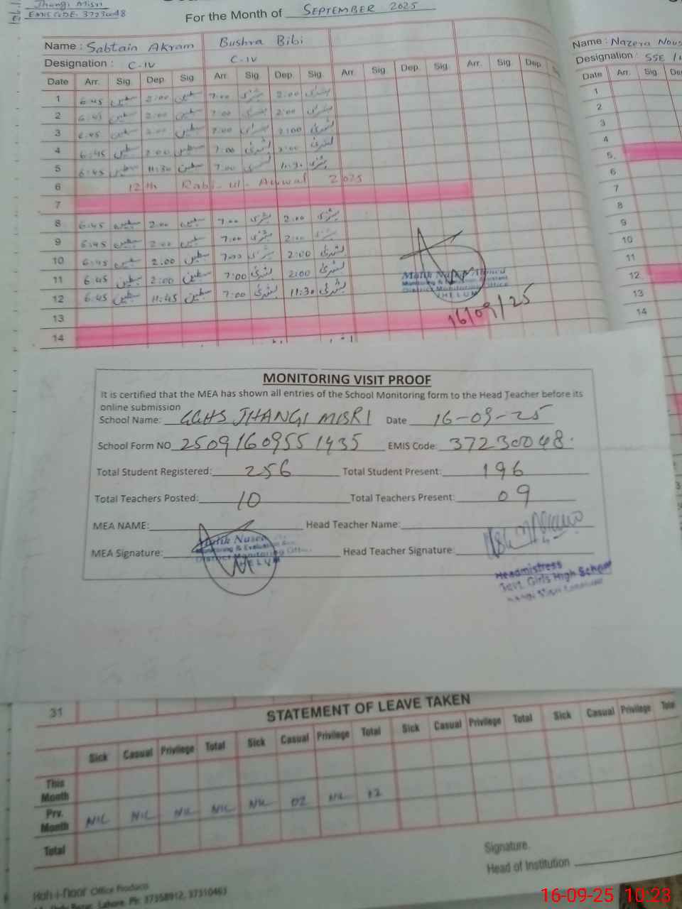 | Attendance Register | Head Teacher | MEA with School | Visit Proof |