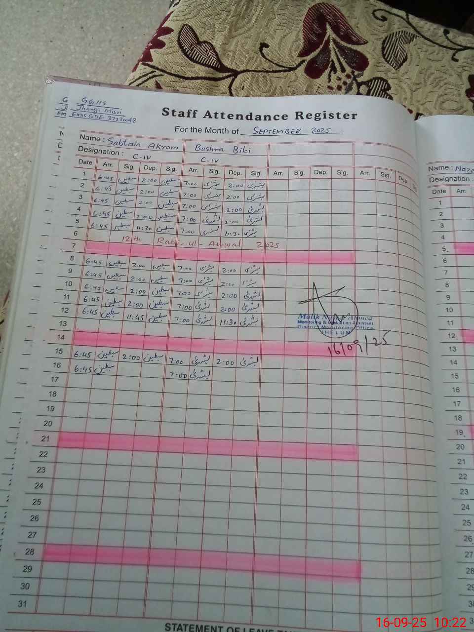 | Monitoring Date: 16-09-2025 | Start Time: 16-09-2025 09:55 AM | End Time: 16-09-2025 10:24 AM | Name of MEA: Na**** Ah**** | |