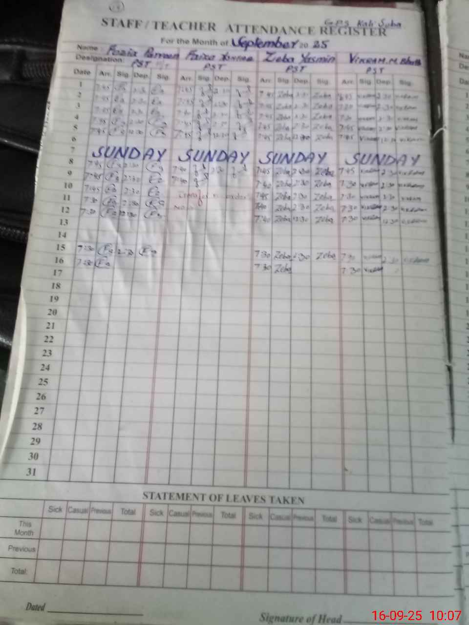 | Leave | Duty | Absent | Maternity | Medical | Ex- Pak |