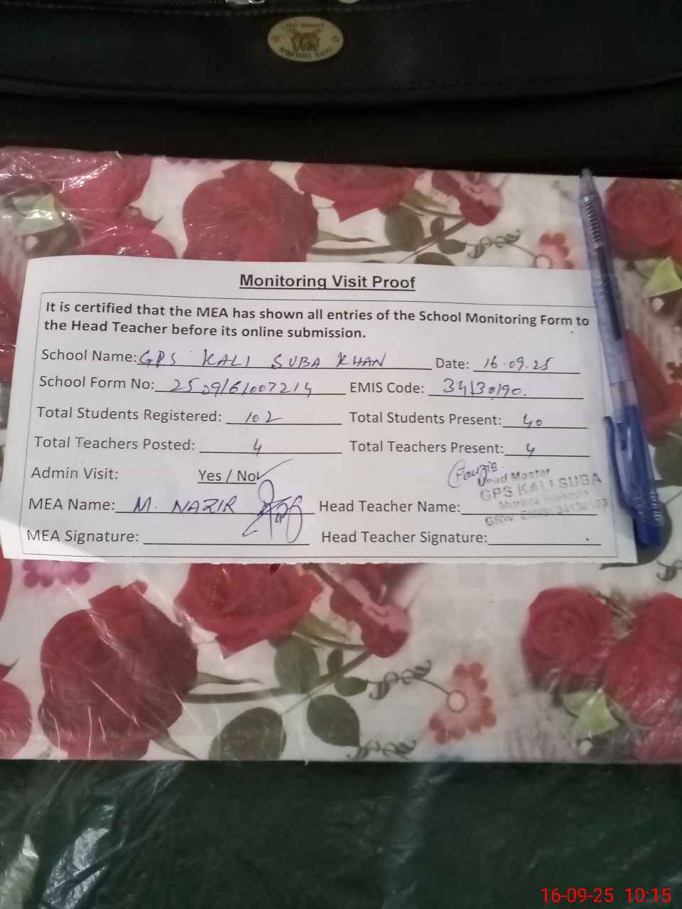 | Attendance Register | Head Teacher | MEA with School | Visit Proof |