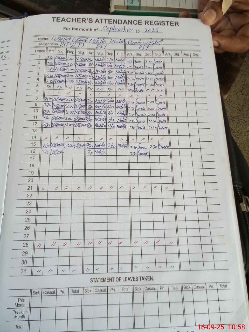 | CNIC | Full Name | Designation | R/C | Absence During Last Calender Month |