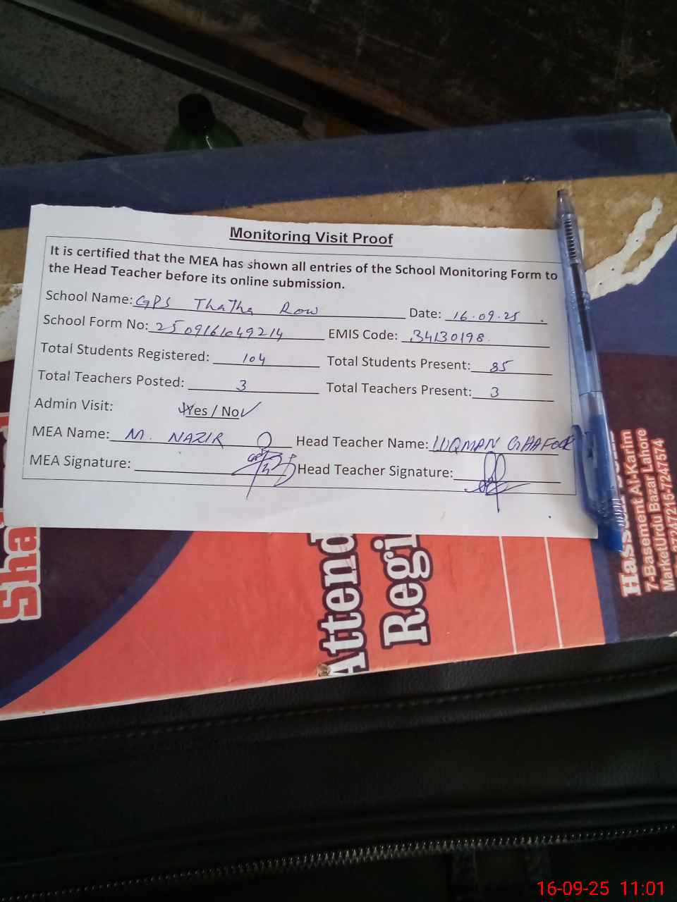 | Attendance Register | Head Teacher | MEA with School | Visit Proof |