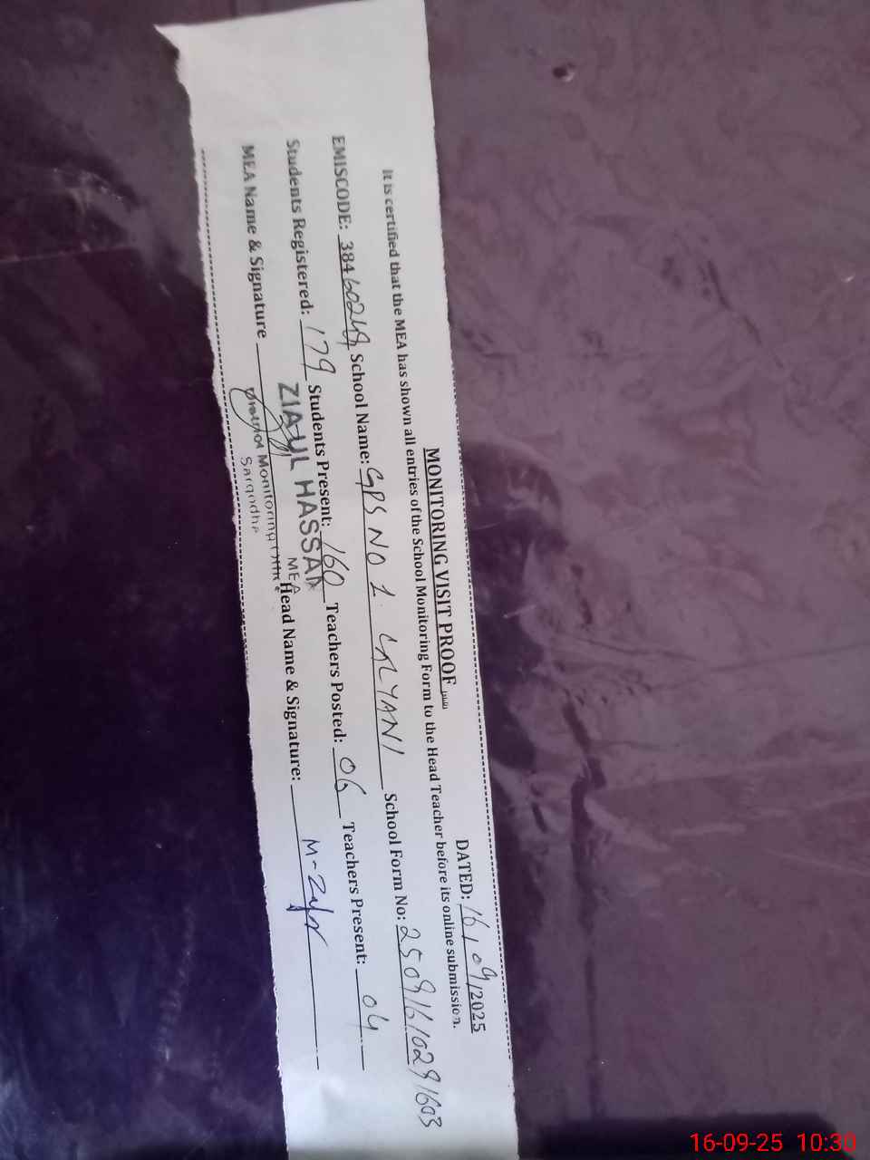 | Monitoring Date: 16-09-2025 | Start Time: 16-09-2025 10:13 AM | End Time: 16-09-2025 10:31 AM | Name of MEA: ZI**** ULHA**** | |