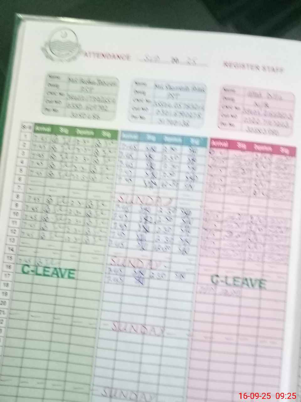 | CNIC | Full Name | Designation | R/C | Absence during last cal. month |