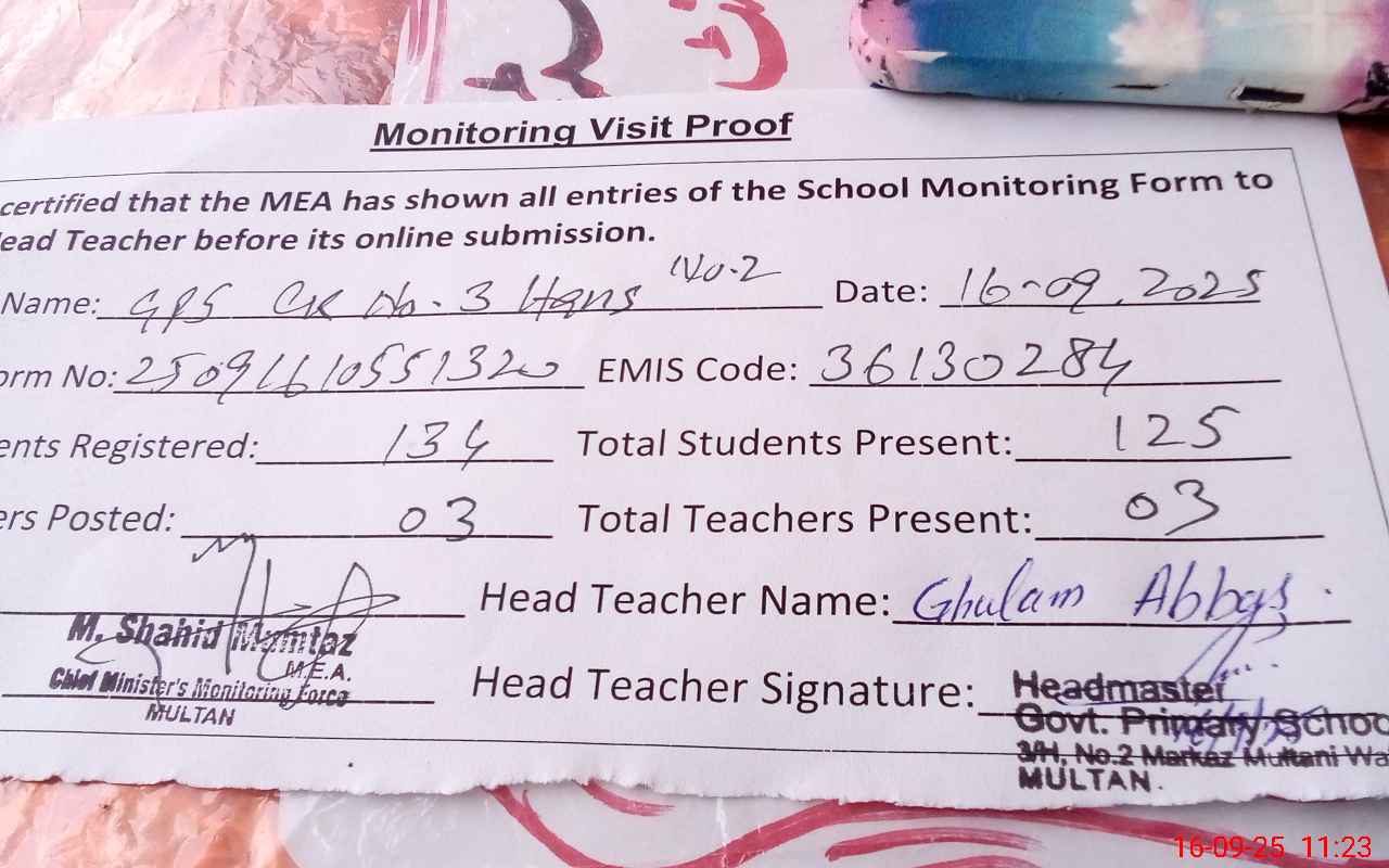 | EMIS Code: 36130284 | Name of School: GPS CHAK NO 3 HAINS NO:2 KOT MELA RAM MULTAN | |||