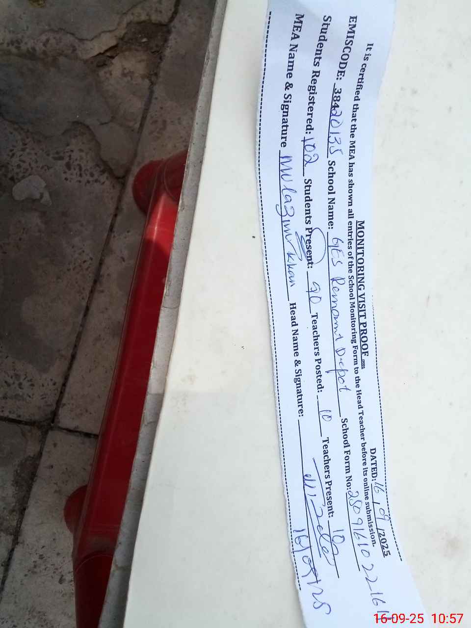 | Monitoring Date: 16-09-2025 | Start Time: 16-09-2025 10:22 AM | End Time: 16-09-2025 10:57 AM | Name of MEA: MU**** KH**** | |