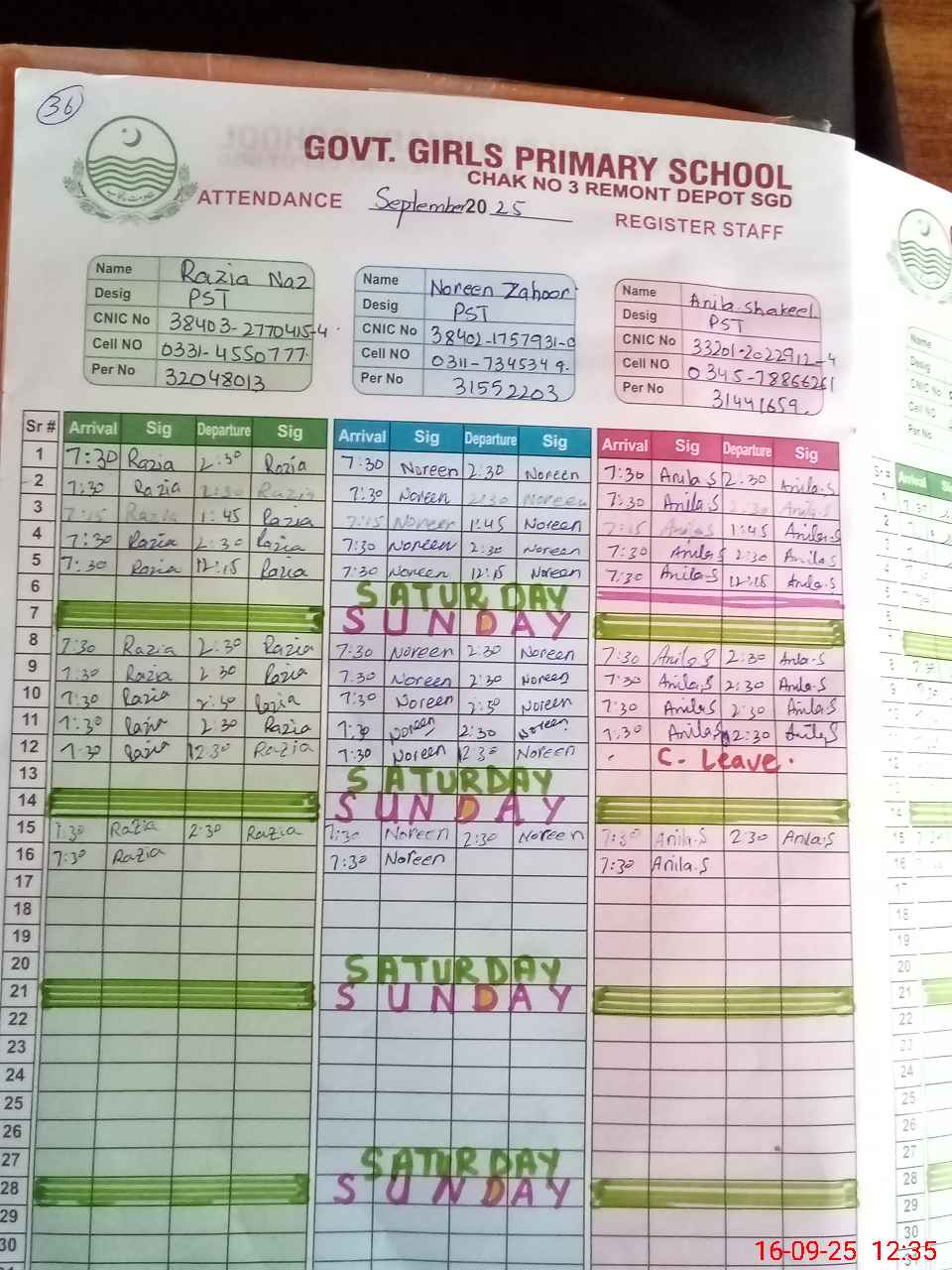 | CNIC | Full Name | Designation | R/C | Absence During Last Calender Month |