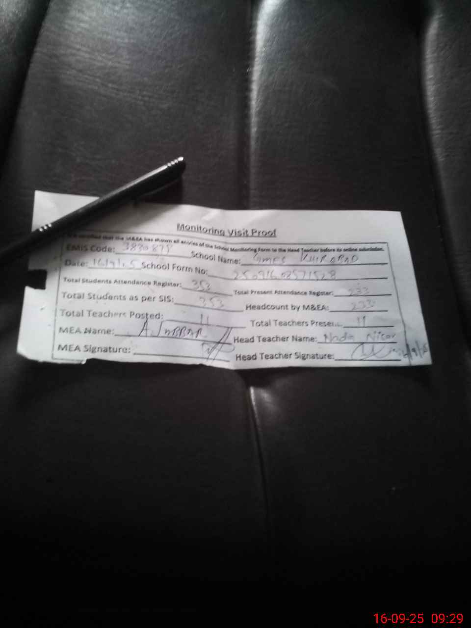| Attendance Register | Head Teacher | MEA with School | Visit Proof |