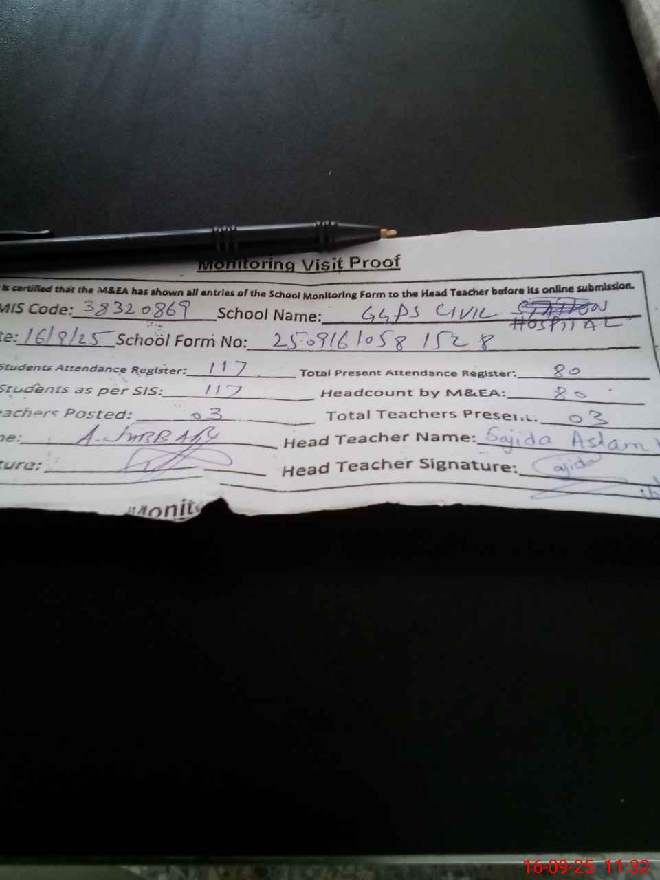 | Attendance Register | Head Teacher | MEA with School | Visit Proof |