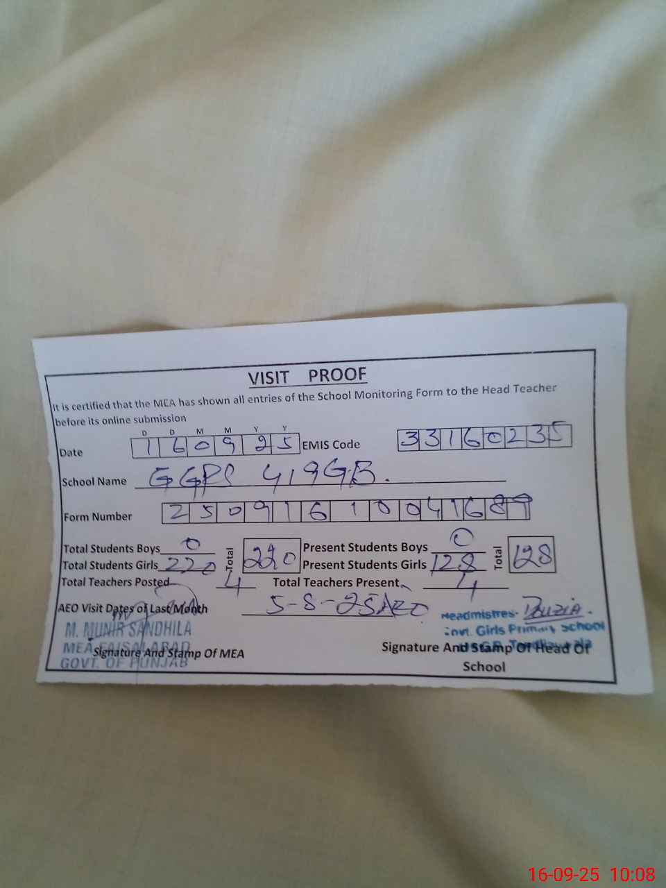 | Attendance Register | Head Teacher | MEA with School | Visit Proof |