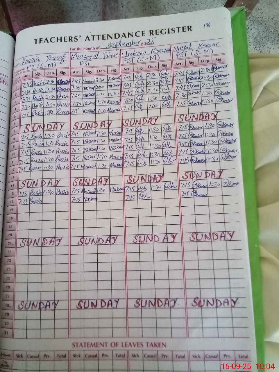 | Leave | Duty | Absent | Maternity | Medical | Ex- Pak |