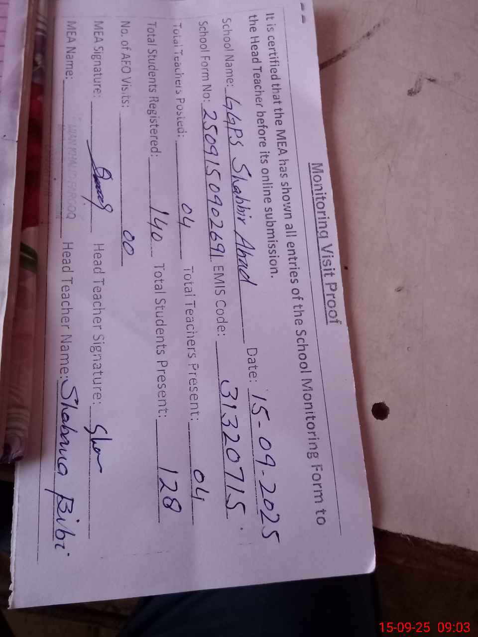| Attendance Register | Head Teacher | MEA with School | Visit Proof |