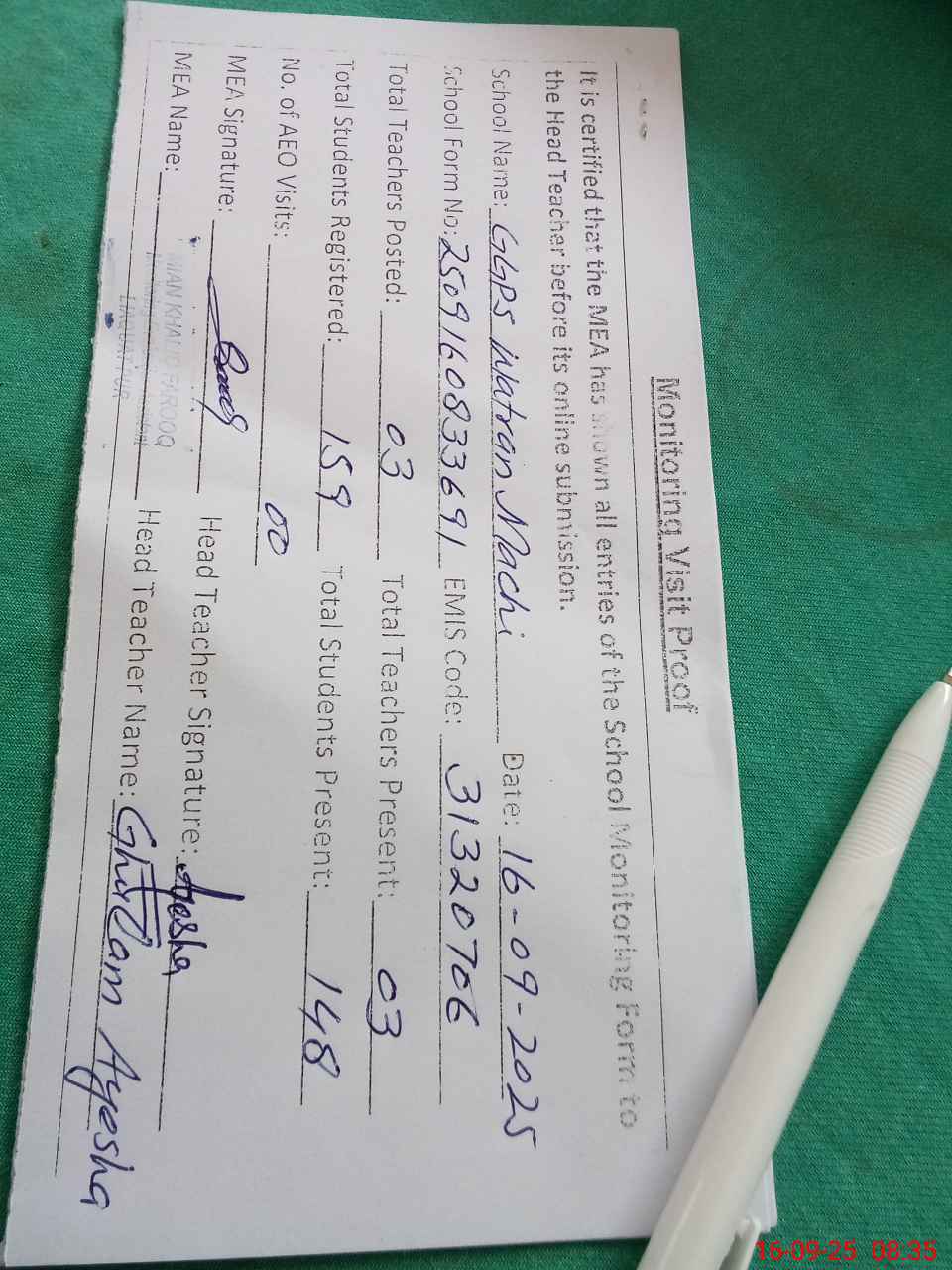 | Attendance Register | Head Teacher | MEA with School | Visit Proof |