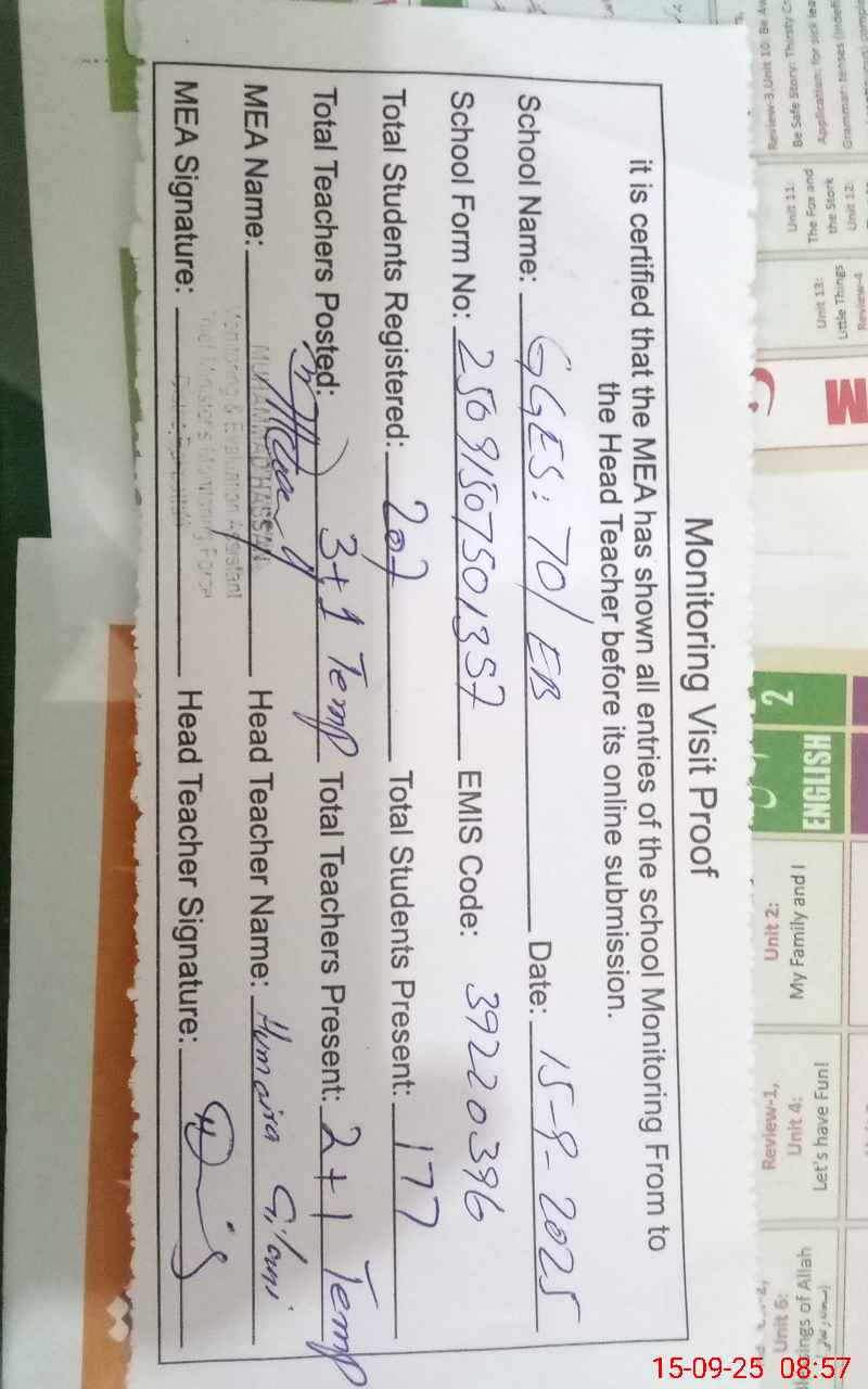 | Attendance Register | Head Teacher | MEA with School | Visit Proof |