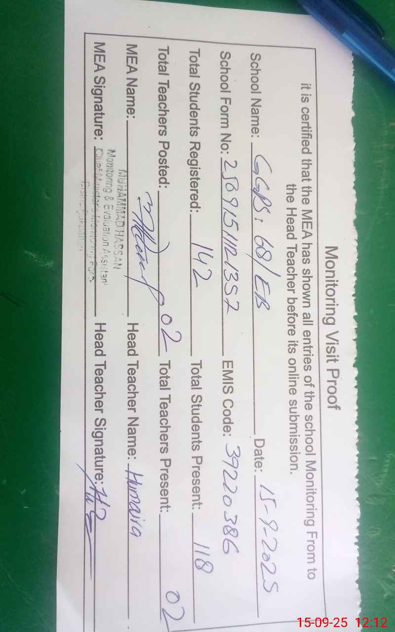 | EMIS Code: 39220386 | Name of School: GGPS 68 EB TEH ARIF WALA | |||