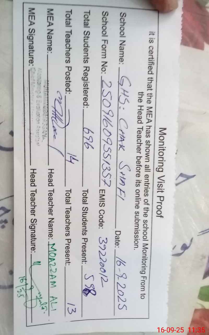 | EMIS Code: 39220012 | Name of School: GHS CHAK SHAFI | |||