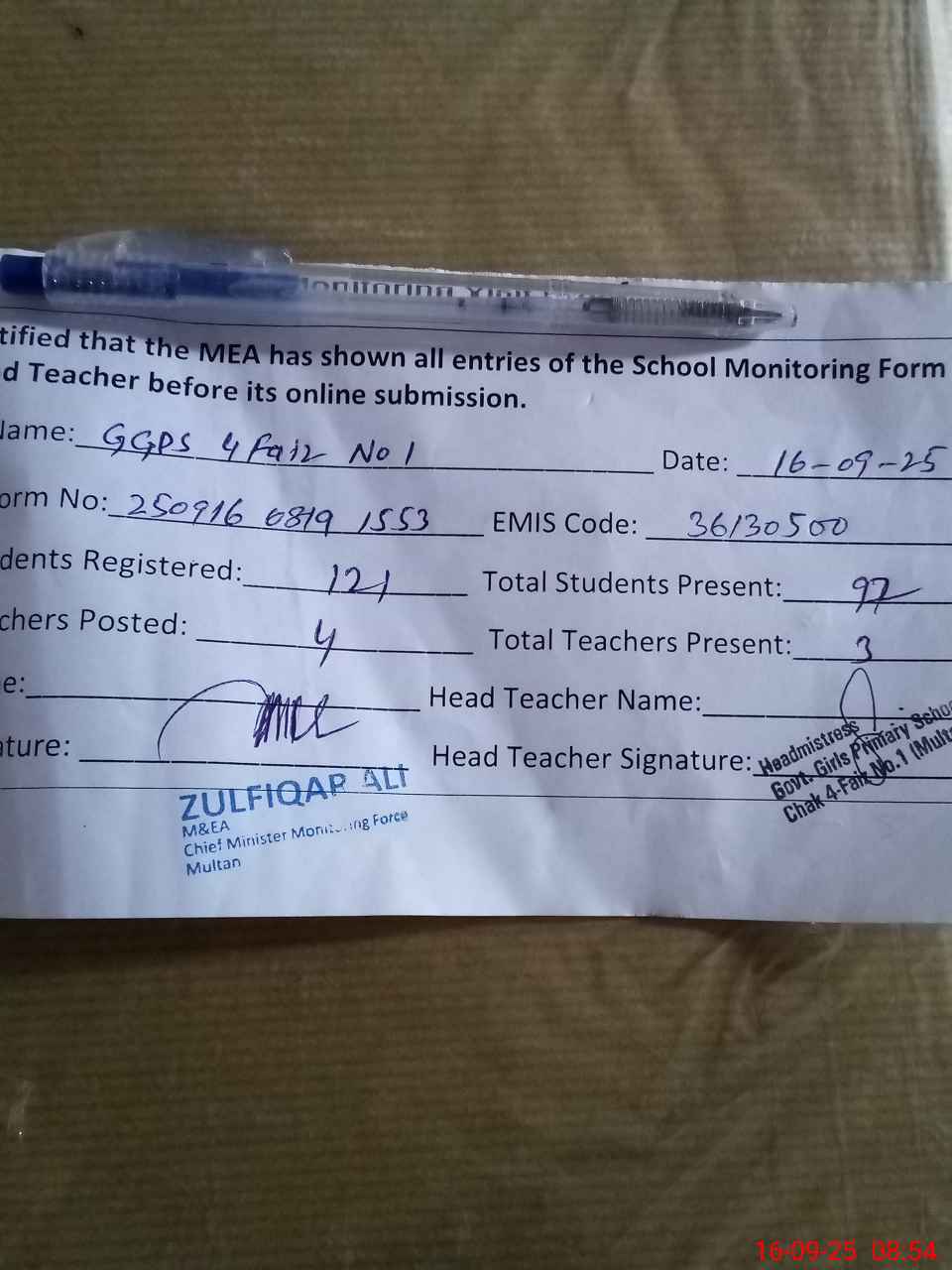 | EMIS Code: 36130500 | Name of School: GGPS 4-FAIZ NO.1 P/O CHAK NO.5 FAIZ MULTAN | |||