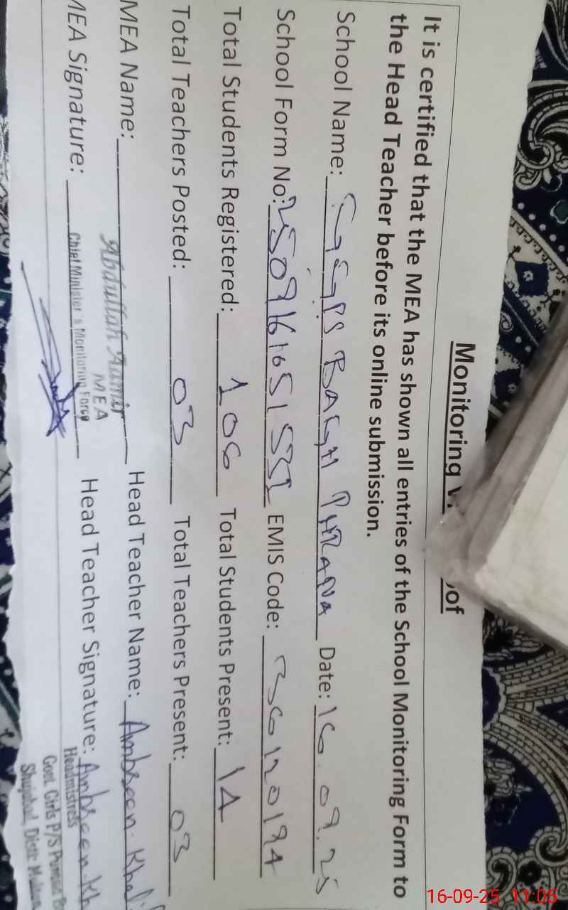 | Name: Am**** Kh**** Designation: (School Headmaster's/Headmistress's) HEADMISTRESS Phone/Cell Number: 03**** |