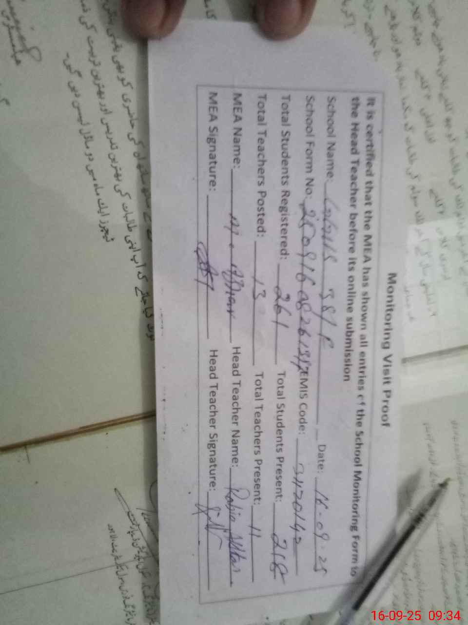| Attendance Register | Head Teacher | MEA with School | Visit Proof |