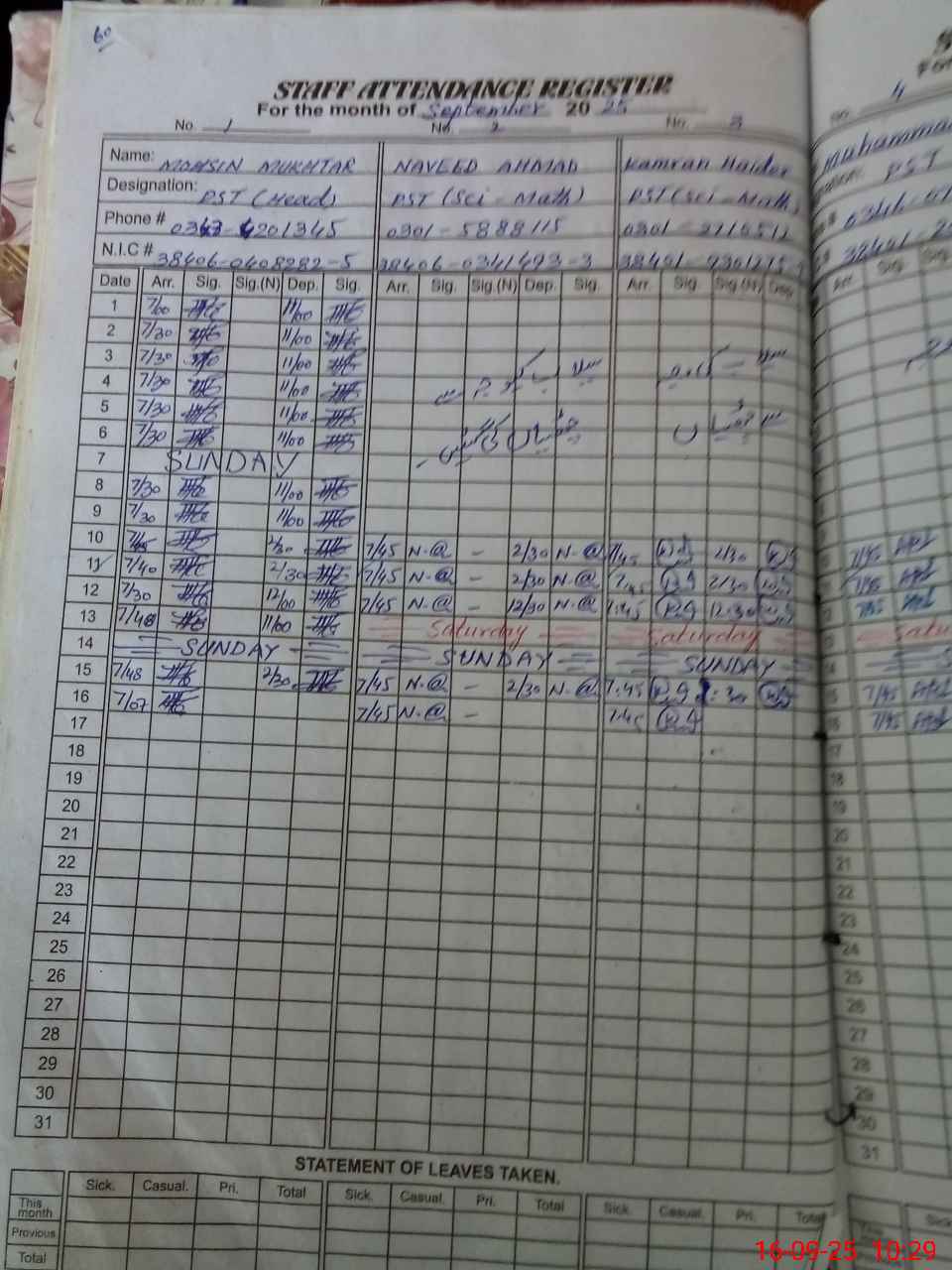 | CNIC | Full Name | Designation | R/C | Absence During Last Calender Month |